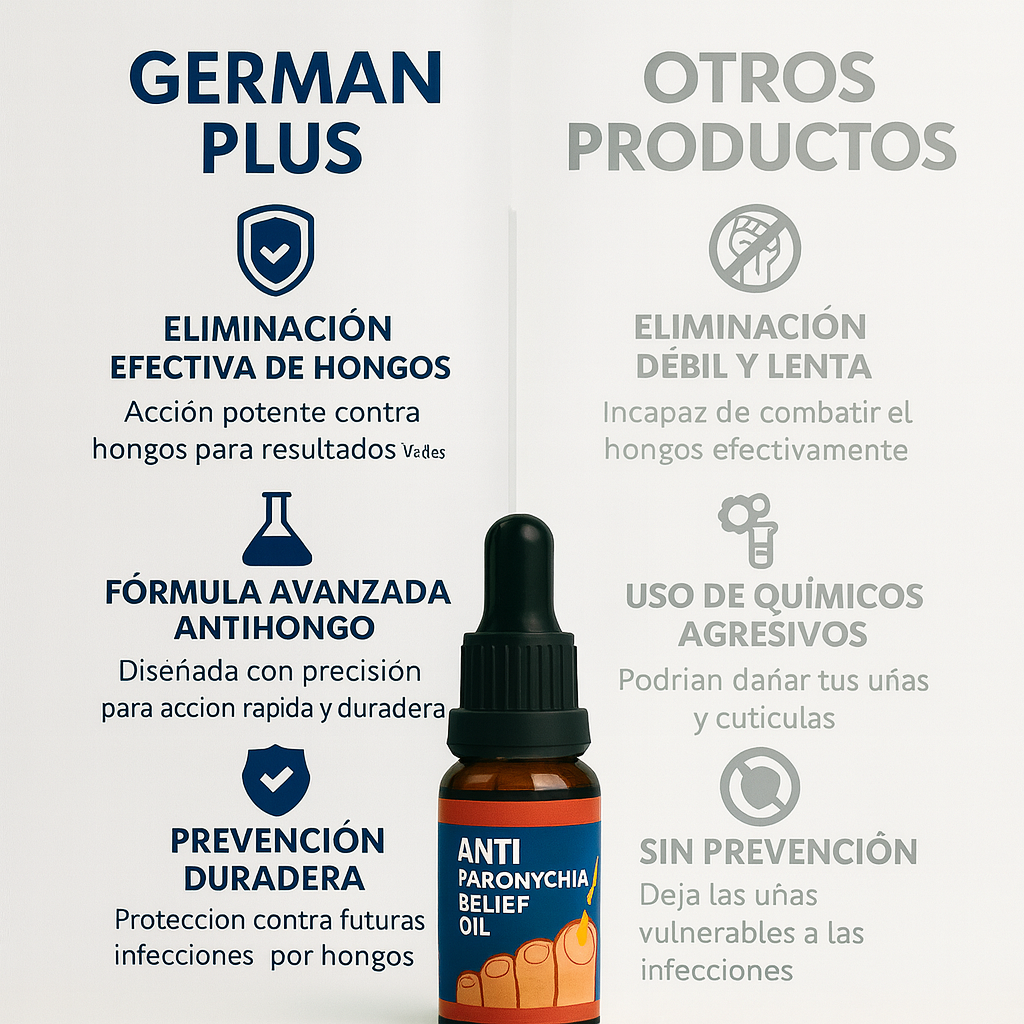 German Plus está diseñado para eliminar los hongos desde la raíz y devolverte la seguridad de mostrar unas uñas sanas, fuertes y hermosas.